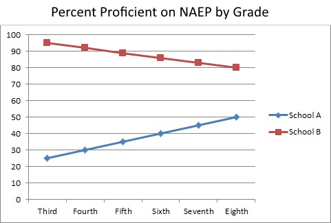 Trends are ignored as well. Which school is succeeding: School A where more students are proficient each year but overall proficiency remains low or School B where fewer students are proficient each year but overall proficiency is higher? Would comparing eighth grade scores of 50 for School A and 80 for School B give you a complete answer?