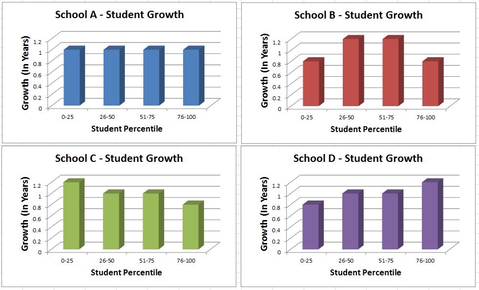 Examine example data from four hypothetical schools below. Each school has the past year’s student growth by quartile. Each school has the students gaining an average of 1.0 year’s growth. Which school is the best?